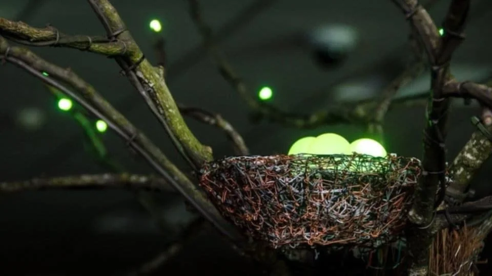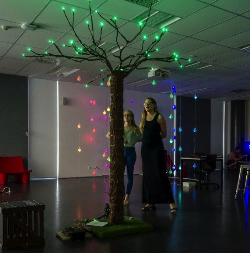 The installation responds to the surrounding audio atmosphere, detecting stress-inducing noise levels and disruptive frequencies. When the environment is agitated or overwhelming, the tree emits chaotic, less harmonious light and sound patterns, encouraging users to reflect on their surroundings. As calm is restored, through quieter behaviour or soothing sound input, the tree responds in kind, glowing with therapeutic colours and playing frequencies associated with emotional balance and tranquility. This response loop allows users to interact with the tree in a way that fosters awareness of how sound and space impact their wellbeing.